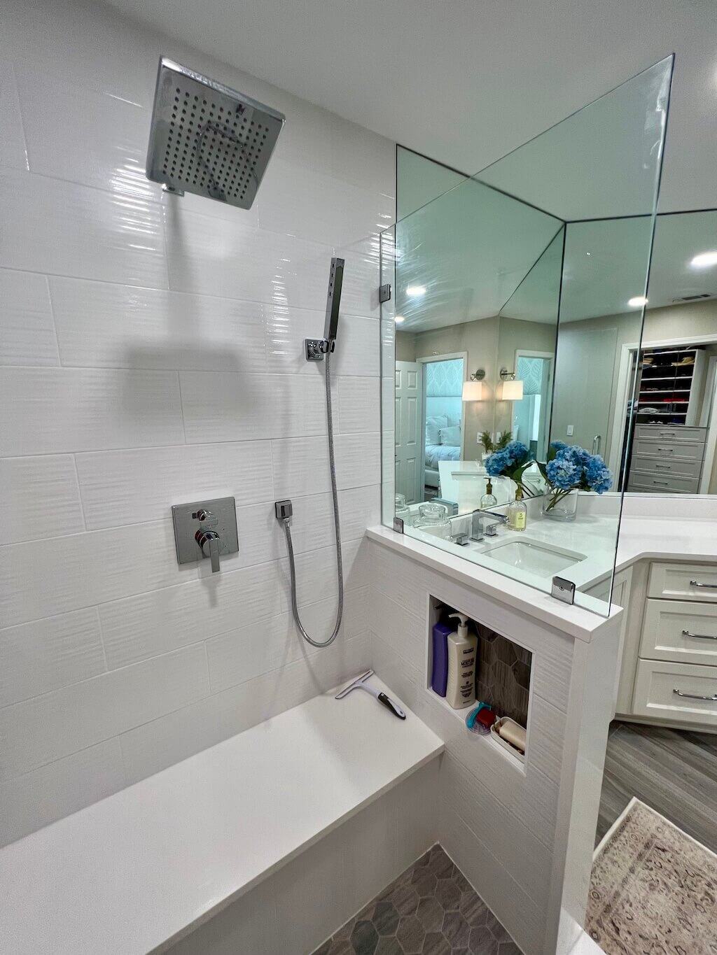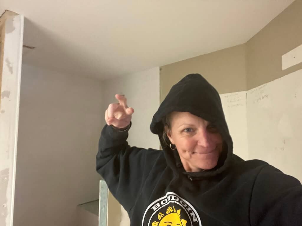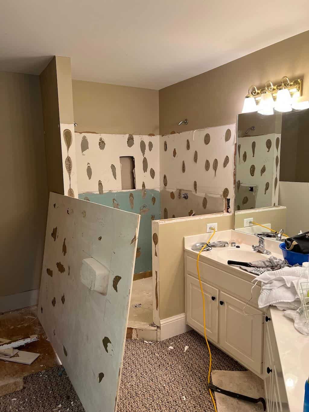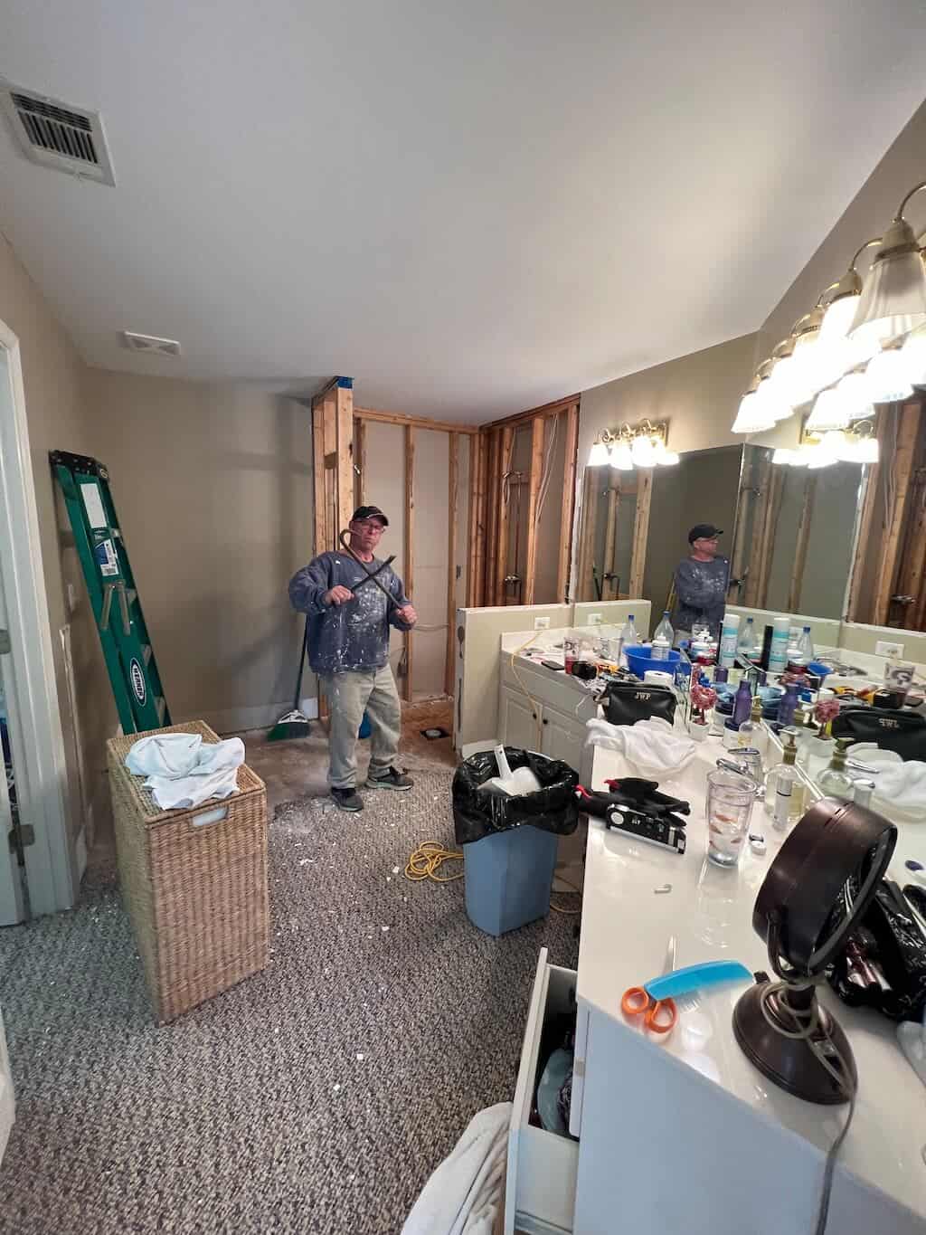He even built a whole new shower wall to make the shower bigger—because apparently, we now remodel with the confidence of people who watch one too many home improvement shows.