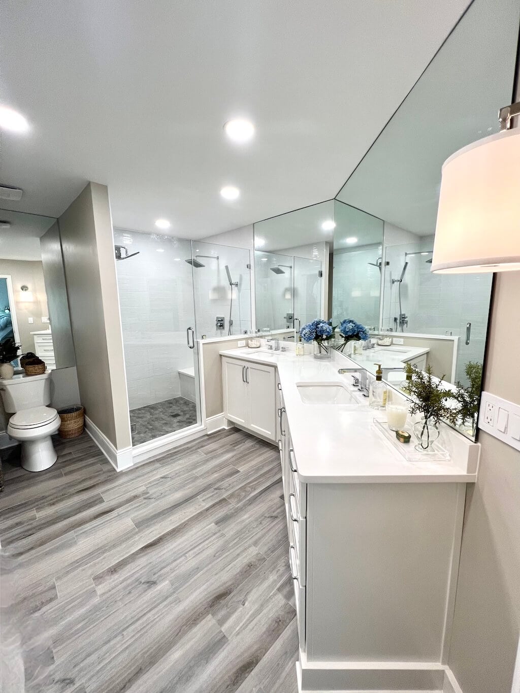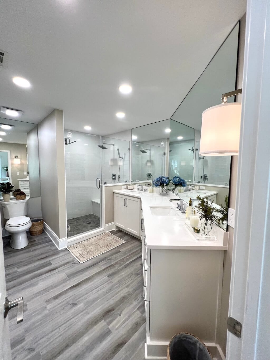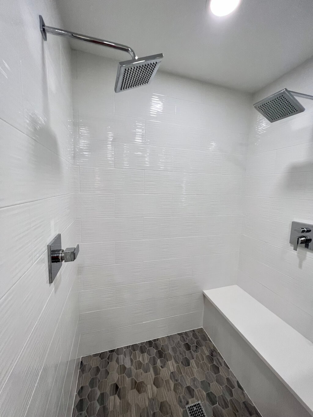 The shower floor now sports a unique hexagon tile, which is basically the bathroom equivalent of wearing statement earrings. And the main floor tile? Gorgeous long gray slabs that look like hardwood but require none of the “please don’t splash water on me” drama that real wood brings.