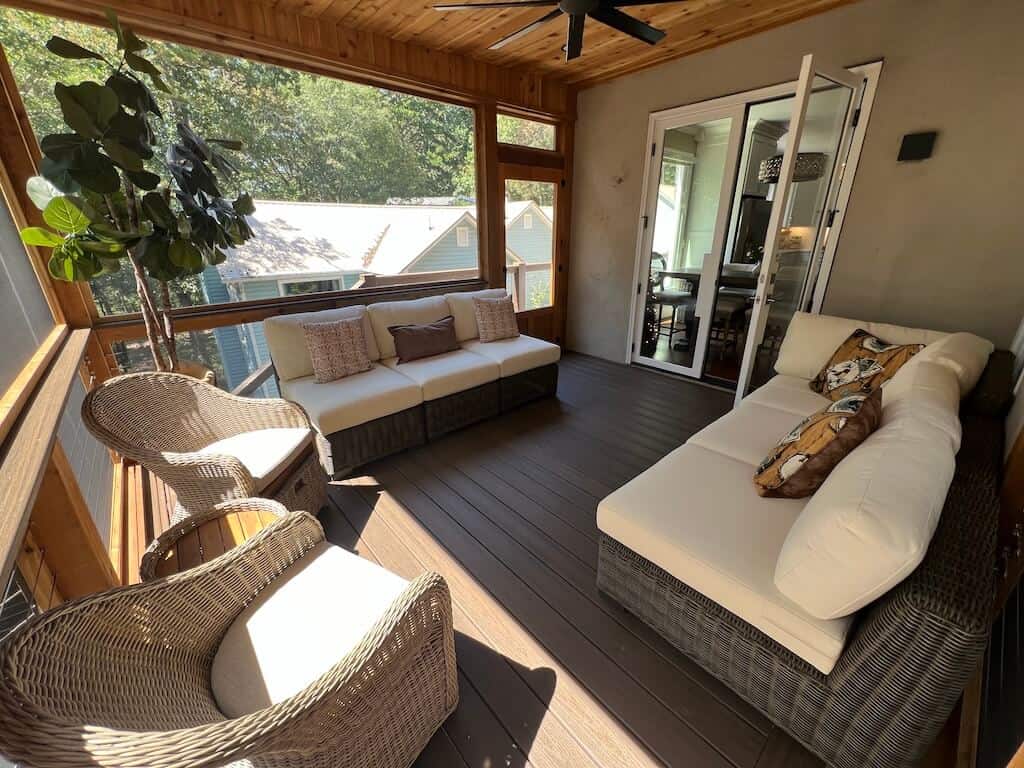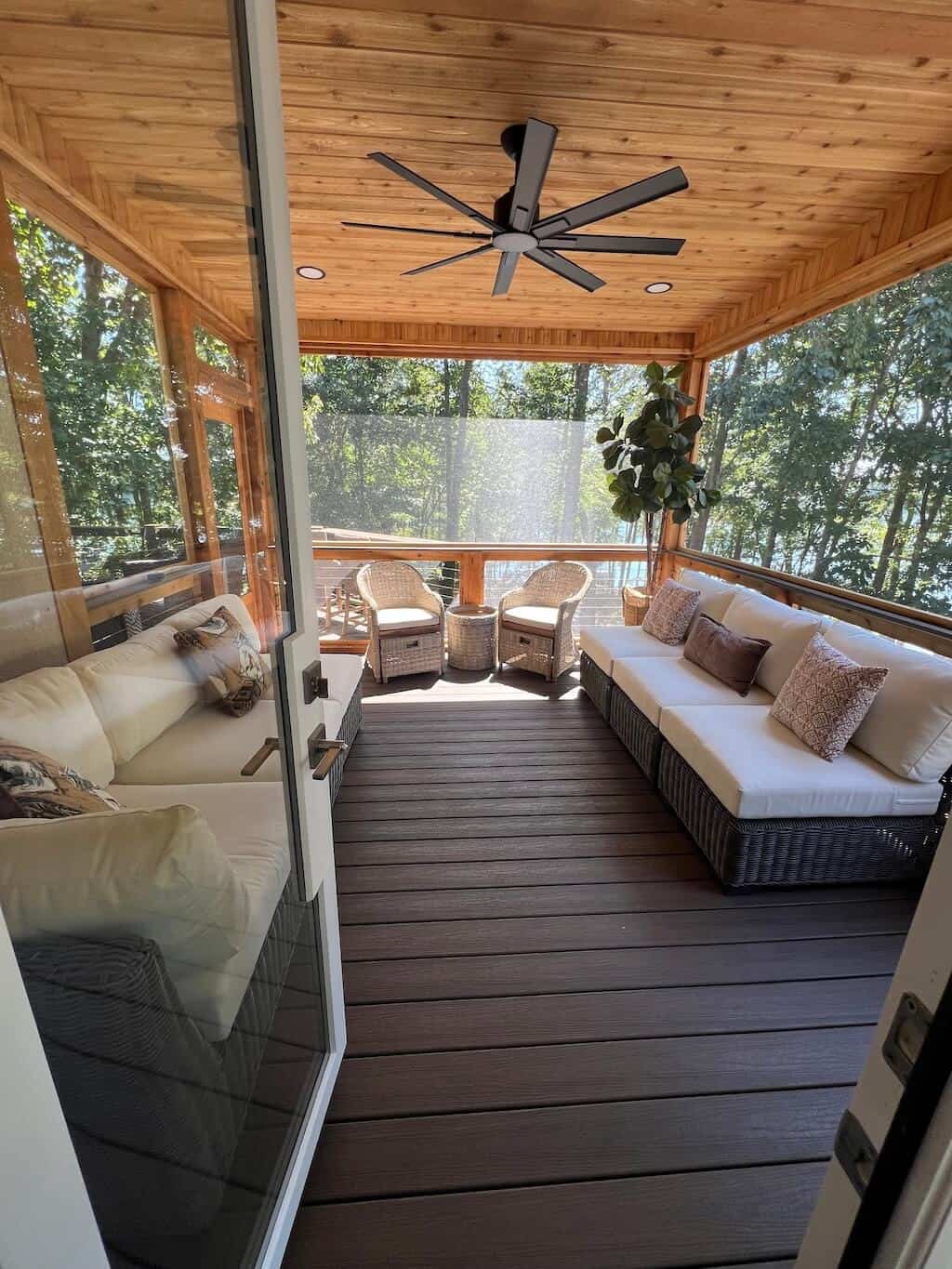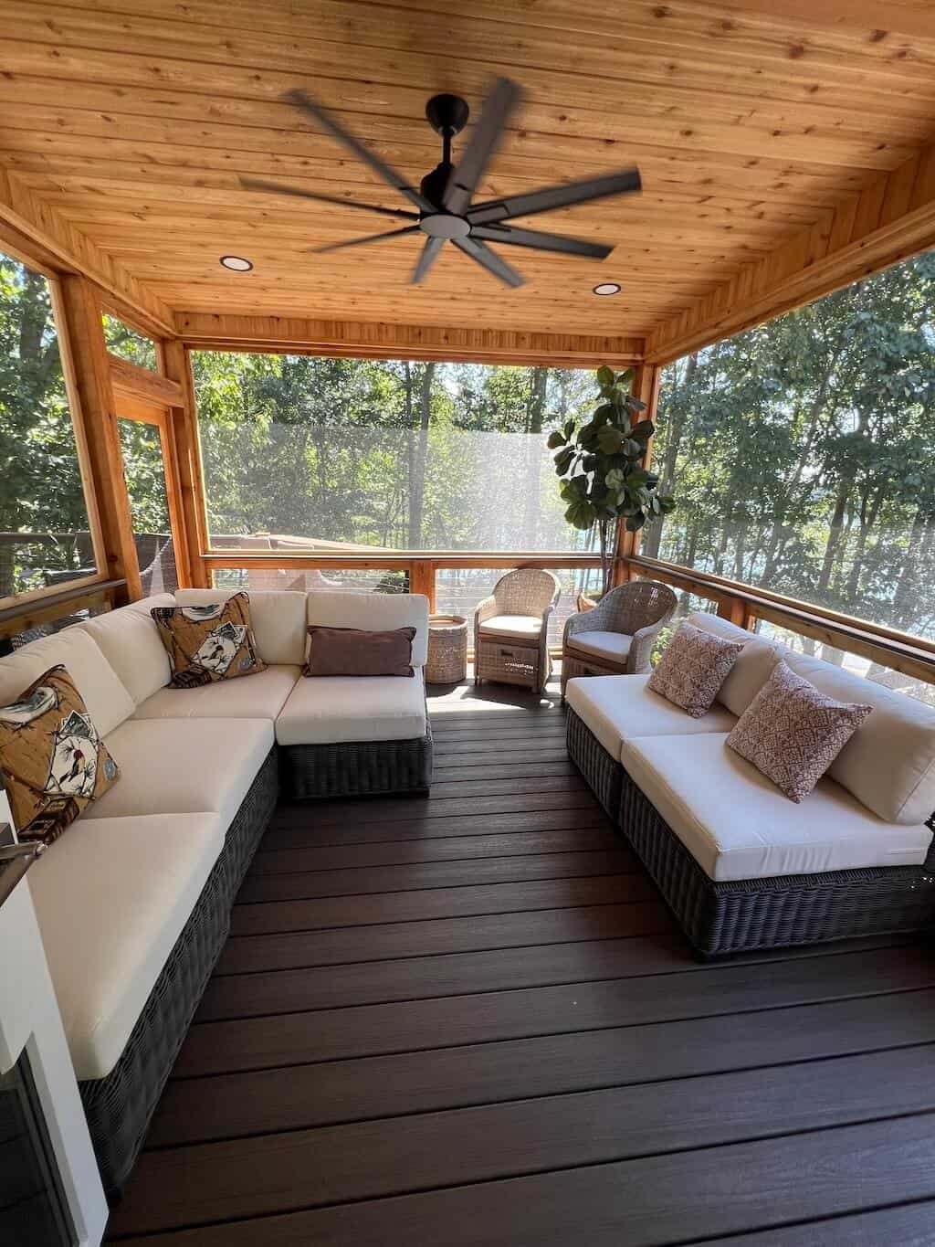 The interior color of the screened porch is all cedar with clear stain. It is fantastic. It emulates the surrounding area and blends beautifully with the outdoors. We are at the lake! ✔️